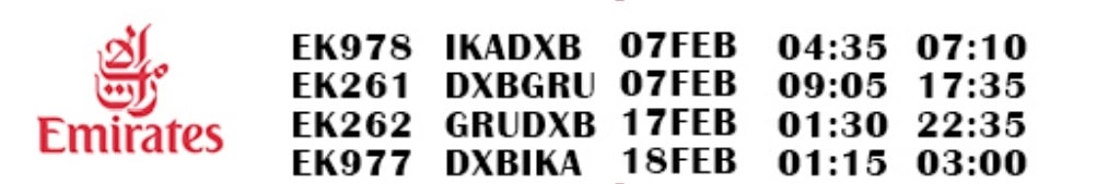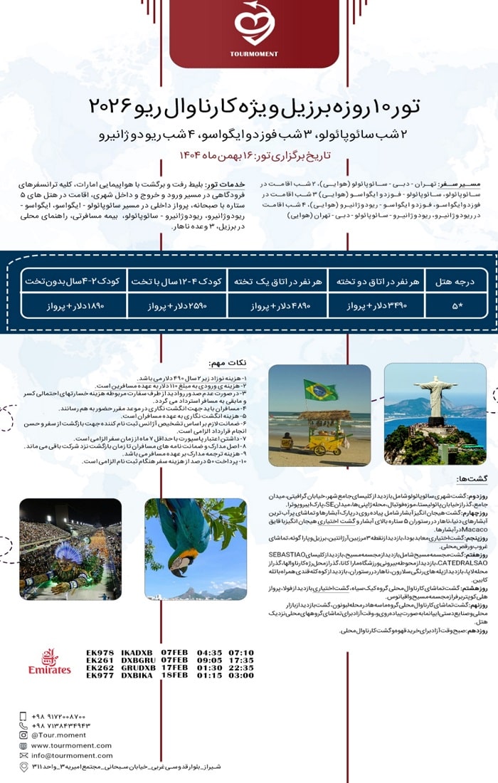 مسیر سفر: تهران – دبی – سائوپائولو (هوایی)، ۲ شب اقامت در سائوپائولو، سائوپائولو – فوزدواگواسو (هوایی)، ۳ شب اقامت در فوزدواگواسو، فوزدواگواسو – ریودوژانیرو (هوایی)، ۴ شب اقامت در ریودوژانیرو، ریودوژانیرو – سائوپائولو – دبی – تهران (هوایی)