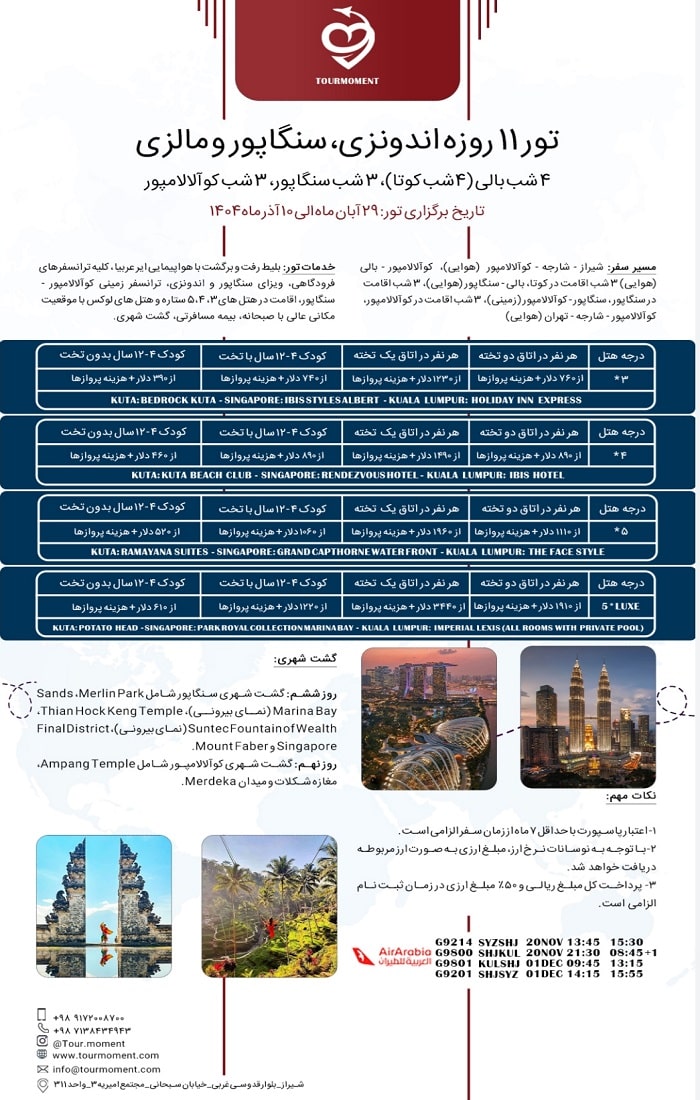 مسیر سفر: شیراز – شارجه – کوآلالامپور (هوایی)، کوآلالامپور – بالی (هوایی)، ۳ شب اقامت در کوتا، بالی – سنگاپور (هوایی)، ۳ شب اقامت در سنگاپور، سنگاپور – کوآلالامپور (زمینی)، ۳ شب اقامت در کوآلالامپور، کوآلالامپور – شارجه – تهران (هوایی).