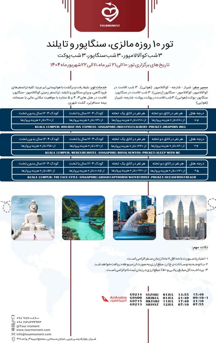 مسیر سفر: شیراز-شارجه-کوآلالامپور (هوایی)، 3 شب اقامت در کوآلالامپور، کوآلالامپور-سنگاپور (زمینی)، 3 شب اقامت در سنگاپور، سنگاپور-پوکت (هوایی)، 3 شب اقامت در پوکت، پوکت-شارجه-شیراز (هوایی)
