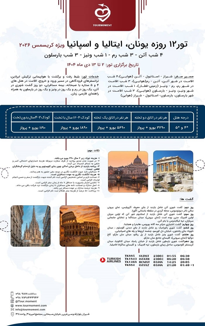 اولین نفری باشید که دیدگاهی را ارسال می کنید برای “تور 12 روزه یونان-ایتالیا-اسپانیا ویژه کریسمس 2026”