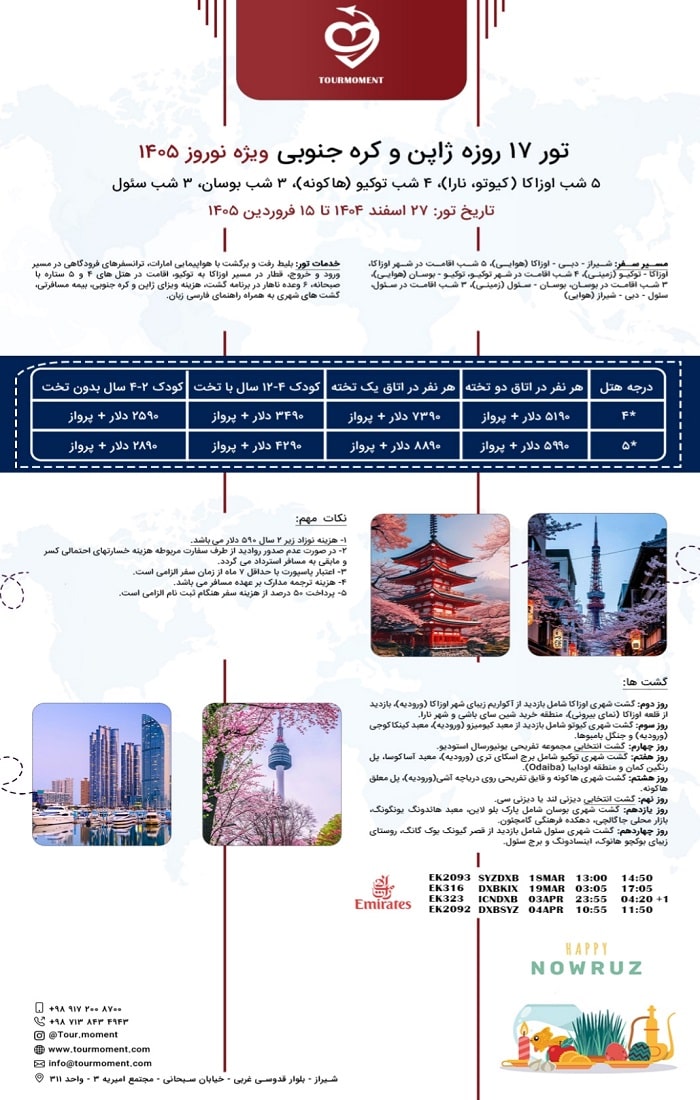 مسیرسفر: شیراز – دبی – اوزاکا (هوایی) ، 5 شب اقامت در شهر اوزاکا، اوزاکا – توکیو (زمینی)، 4 شب اقامت در شهر توکیو، توکیو – بوسان (هوایی)، 3 شب اقامت در بوسان، بوسان – سئول (زمینی)، 3 شب اقامت در سئول، سئول – دبی – شیراز (هوایی).