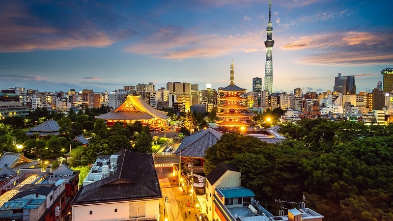 روز هفتم: گشت شهری توکیو شامل برج اسکای تری (ورودیه)، معبد آساکوسا، پل رنگین کمان و منطقه اودایبا (Odaiba)