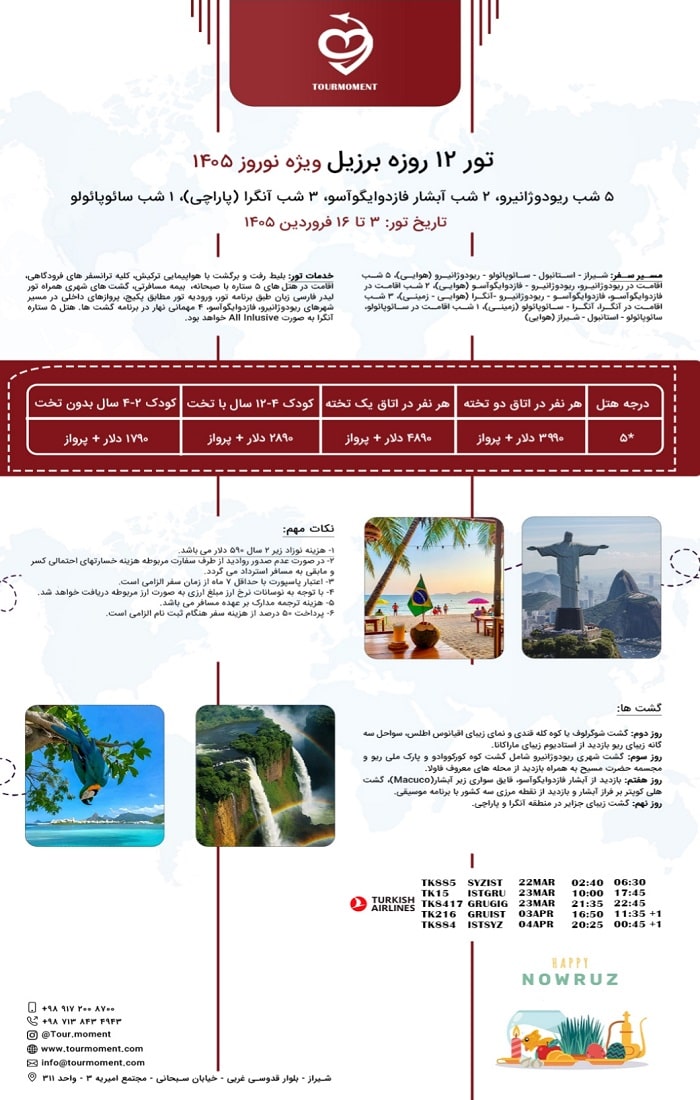 مسیرسفر: شیراز – استانبول – سائوپائولو – ریودوژانیرو (هوایی)، 5 شب اقامت در ریودوژانیرو، ریودوژانیرو – فازدوایگوآسو (هوایی)، 3 شب اقامت در فازدوایگوآسو، فازدوایگوآسو – سائوپائولو (هوایی)، 3 شب اقامت در سائوپائولو، سائوپائولو – استانبول – شیراز (هوایی)