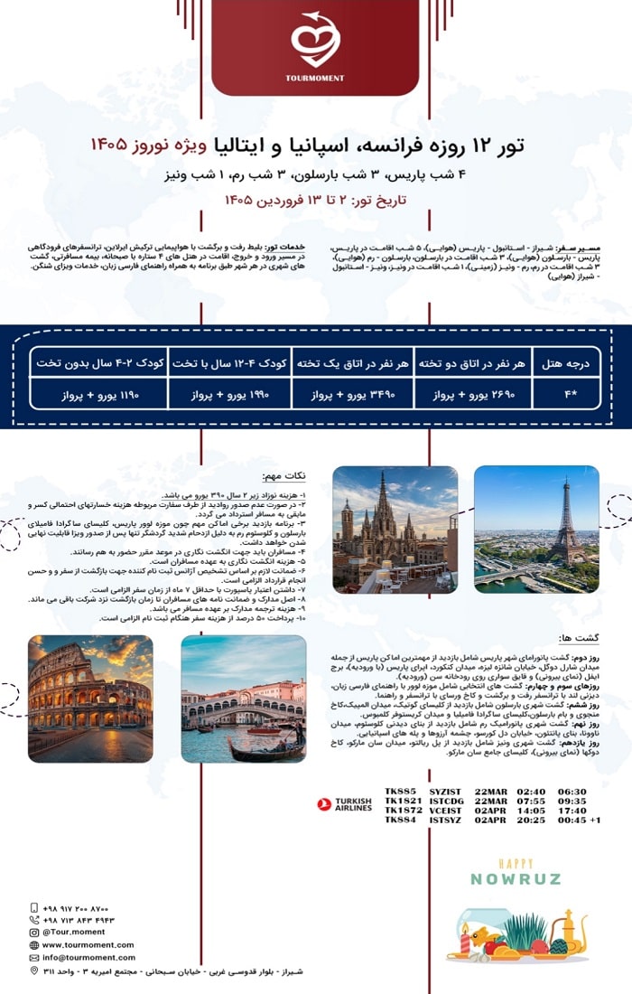 4 شب پاریس – 3 شب بارسلون – 3 شب رم – 1 شب ونیز
