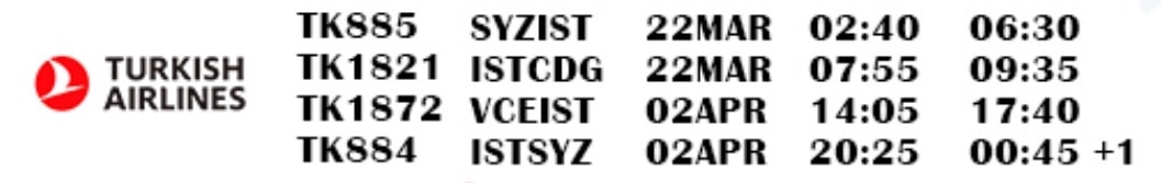 مسیر سفر: شیراز – استانبول – پاریس (هوایی)، 5 شب اقامت در پاریس، پاریس – بارسلون (هوایی)، 3 شب اقامت در بارسلون، بارسلون – رم (هوایی)، 3 شب اقامت در رم، رم – ونیز (زمینی)، 1 شب اقامت در ونیز، ونیز – استانبول – شیراز (هوایی)