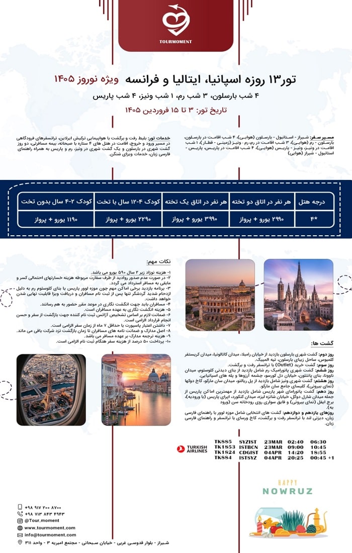 مسیر سفر: شیراز – استانبول – بارسلون (هوایی)، 4 شب اقامت در بارسلون، بارسلون – رم (هوایی)، 3 شب اقامت در رم، رم – ونیز (زمینی – قطار)، 1 شب اقامت در ونیز، ونیز – پاریس (هوایی)، 4 شب اقامت در پاریس، پاریس – استانبول – شیراز (هوایی)