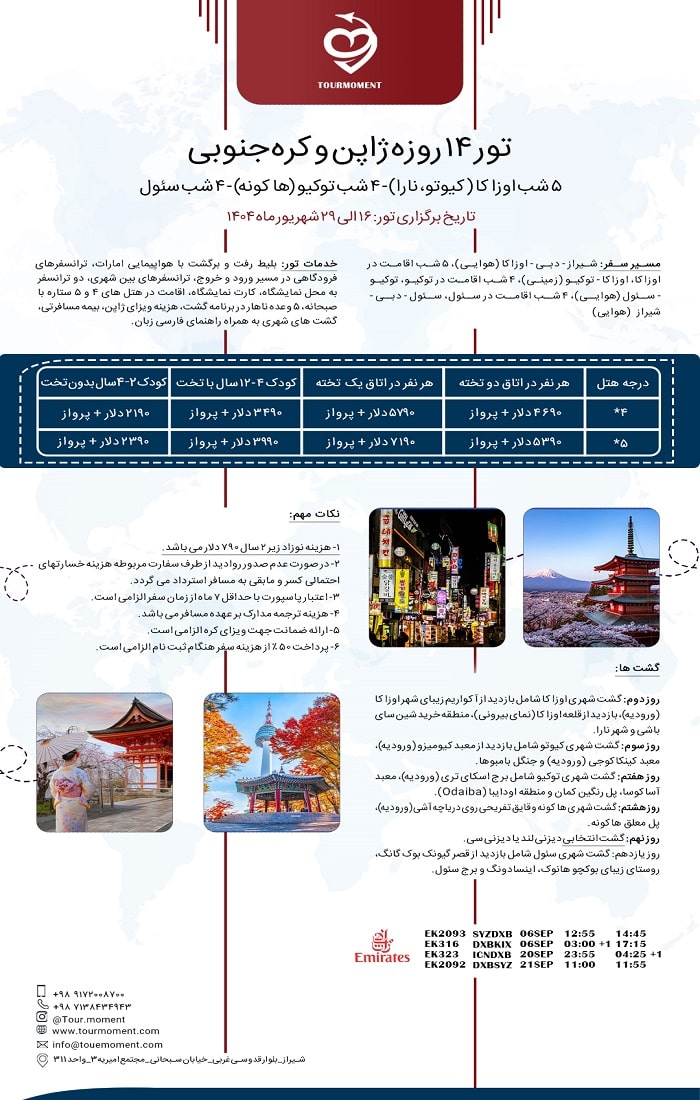 مسیرسفر: شیراز-دبی-اوزاکا (هوایی)، 5 شب اقامت در اوزاکا، اوزاکا-توکیو (زمینی)، 4 شب اقامت در توکیو، توکیو-سئول (هوایی)، 4 شب اقامت در سئول، سئول-دبی-شیراز (هوایی)
