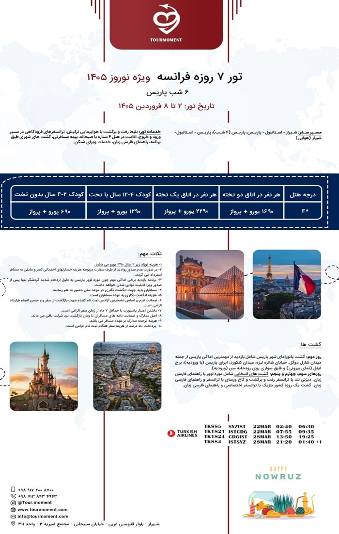 مسیر سفر: شیراز – استانبول – پاریس، پاریس (6 شب)، پاریس – استانبول – شیراز (هوایی)