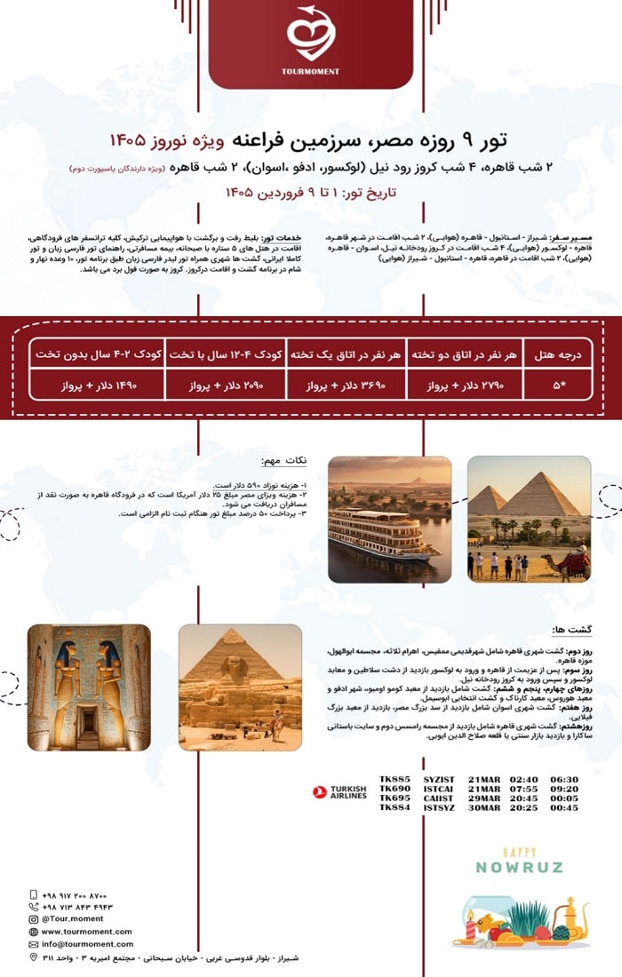 مسیر سفر: شیراز – استانبول – قاهره (هوایی)، 2 شب اقامت در شهر قاهره، قاهره – لوکسور (هوایی)، 4 شب اقامت در کروز رودخانه نیل، اسوان – قاهره (هوایی)، 2 شب اقامت در قاهره، قاهره – استانبول – شیراز ( هوایی)